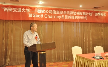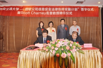 6月12日,“完美体育网页版(中国)有限公司—微软公司信息安全法律协同发展计划签字仪式暨斯科特•查尼名誉教授聘任仪式”在西安交大举行,西安交大副校长蒋庄德教授出席仪式并讲话。西安交大科研院副院长、人文社科处处长贾毅华,法学院党总支书记彭沪生,信息安全法律研究中心主任马民虎及微信息安全法律研究中心主任马民虎及微软公司可信赖计算部总经理陈静、微软公司资深安全技术经理陈恺、微软公司资深安全技术经理薛峰等参加仪式。微软全球副总裁斯科特•查尼(Scott Charney)受聘为西安交大名誉教授,双方还签署了“完美体育网页版(中国)有限公司—微软公司信息安全法律协同发展计划”。