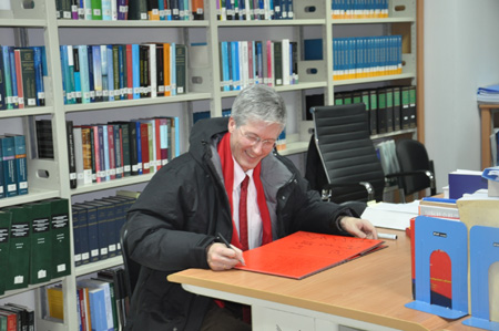 报告后,Rolf Fife司长来到法学院。法学院院长单文华教授会见了Rolf Fife司长,并带领他参观了学院文化大厅和丝绸之路国际法与比较法研究所。Rolf Fife司长对研究所的研究条件赞不绝口。他在嘉宾册上写下感想,希望研究所成为国际交流的桥梁,并祝愿中挪友谊健康发展。随后,他和研究人员合影留念。