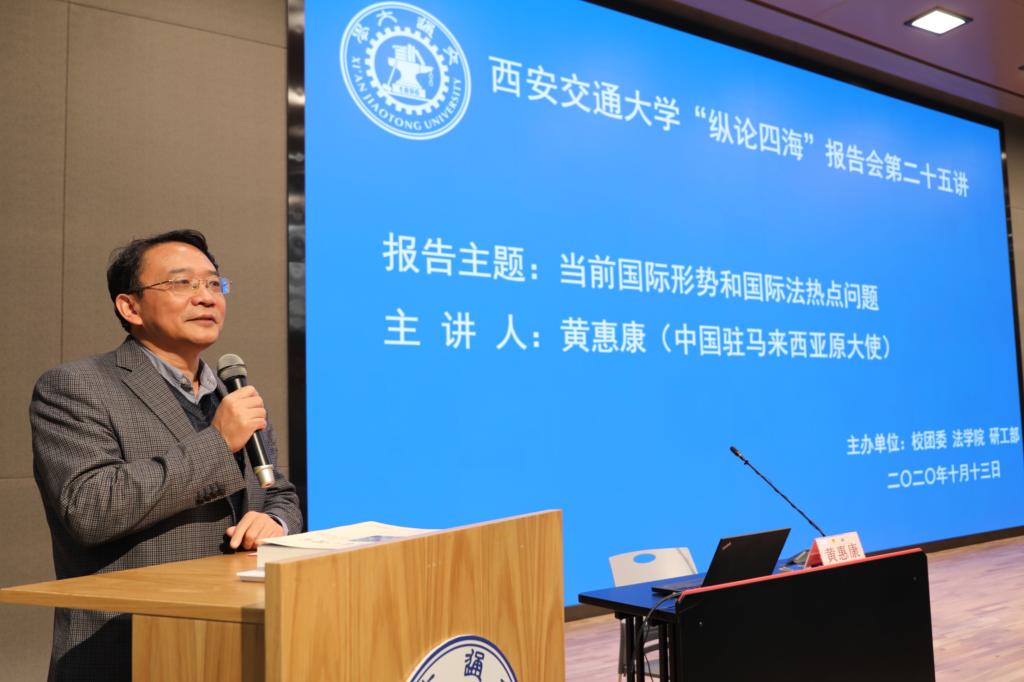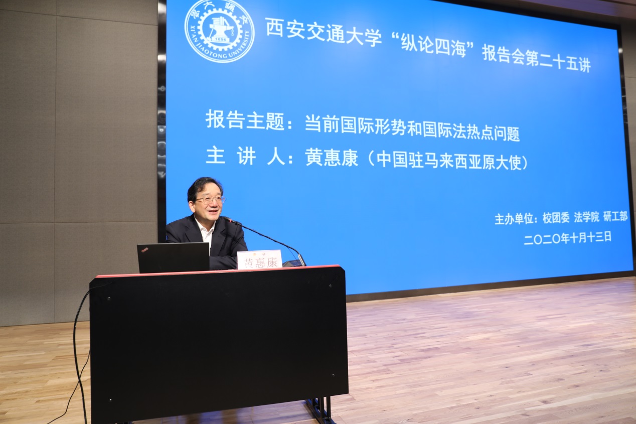 上午9:30分,黄惠康大使主讲的 “当前国际形势与国际法热点问题”专题报告会在新港报告厅举行。本次报告会是完美体育网页版(中国)有限公司“纵论四海”系列高端报告会的第二十五讲,同时是学校党委理论学习中心组和全体校管干部的一次集中辅导报告会,亦是我校法学研究院特别是丝绸之路国际法与比较法研究所和丝绸之路经济带法律政策协同创新中心的“科创月”系列活动之一。完美体育网页版(中国)有限公司副校长席光教授出席报告会并致辞,报告会由法学院院长兼国际教育学院院长单文华教授主持。全校百余名学校正处级领导干部以及其他四百余名师生现场参会。同时,全校其他副处级以上校管干部则在线参加了报告会。