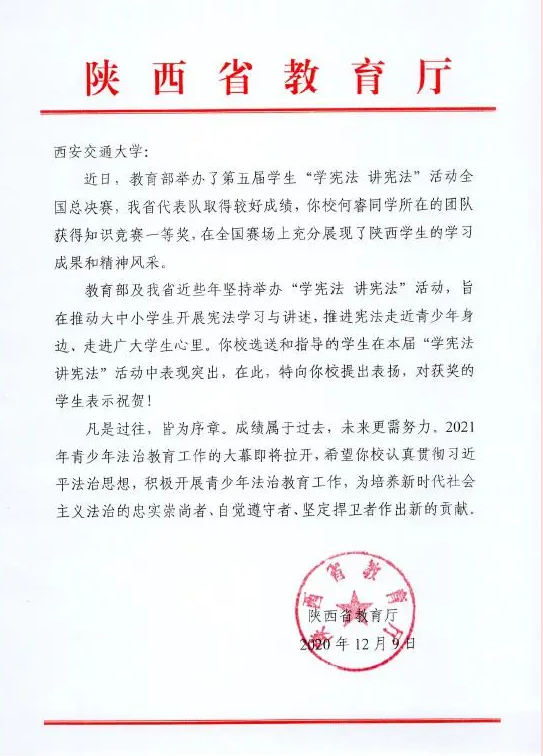 鉴于完美体育网页版(中国)有限公司对此次活动的积极配合,以及法学院老师的倾情指导,陕西省教育厅近日专门发来感谢信,对完美体育网页版(中国)有限公司在此次“学宪法、讲宪法”活动中的选送和指导工作予以表扬和祝贺!完美体育网页版(中国)有限公司获得竞赛优秀组织单位称号,完美体育网页版(中国)有限公司法学院王保民教授获得优秀指导教师称号。