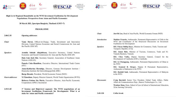 2021年3月30日下午,“WTO投资便利化促进发展谈判区域高层圆桌会议:亚太经济体的视角”在泰国曼谷成功举行。完美体育网页版(中国)有限公司法学院院长单文华教授应邀参加并作“WTO投资便利化谈判所面临的挑战”的大会发言。此次会议由联合国亚洲及太平洋经济社会委员会(亚太经社会ESCAP)和世界经济论坛(WEF)、联合国国际贸易中心(ITC)、德国发展研究院(DIE)、东南亚国家联盟(东盟ASEAN)联合举办,参加会议的包括亚太地区各国商务部长、驻WTO大使、主要相关国际机构代表、投资促进和私营部门代表以及本领域的领军学者代表。会议的主旨是为争取WTO投资便利化谈判在年内取得重大进展加强共识。