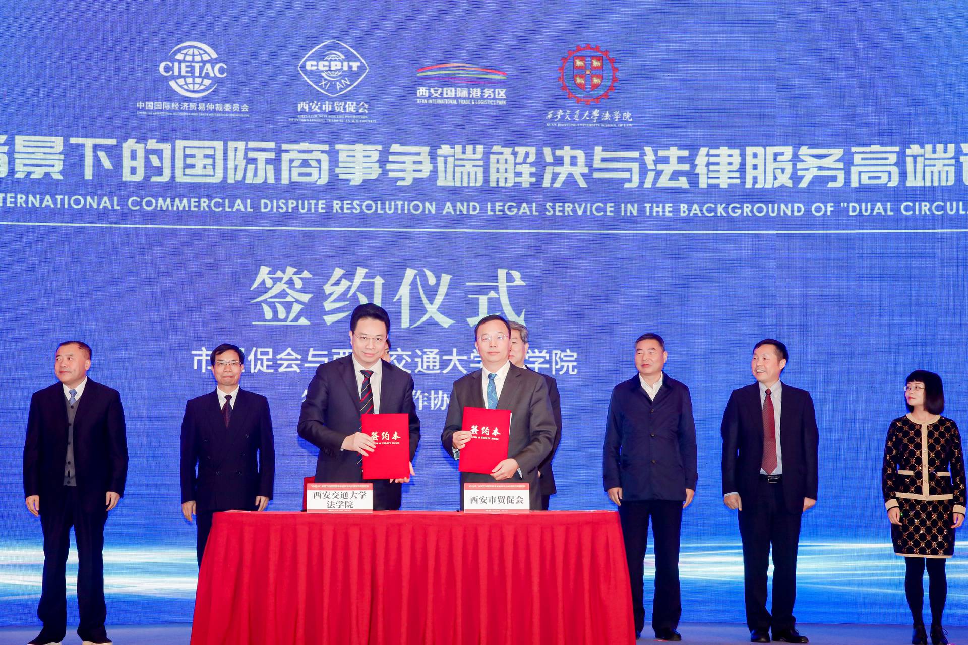 (从左到右、从上到下依次为:完美体育网页版(中国)有限公司法学院院长、国际投资争端解决中心(ICSID)调解员、最高人民法院国际商事专家委员会专家委员单文华,陕西省高级人民法院副院长巩富文,国际独立仲裁员、最高人民法院国际商事专家委员会专家委员陶景洲,西北政法大学丝绸之路区域合作与发展法律研究院院长、陕西省三秦学者王瀚)