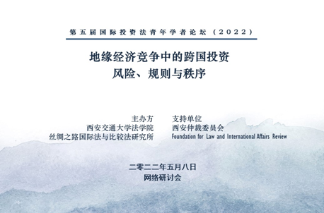 2022年5月8日,第五届国际投资法青年学者论坛顺利线上举行。本届论坛以“地缘经济竞争中的跨国投资:风险、规则与秩序”为主题,由完美体育网页版(中国)有限公司法学院丝绸之路国际法与比较法研究所主办,并由西安仲裁委员会、Foundation for Law and International Affairs Review支持。