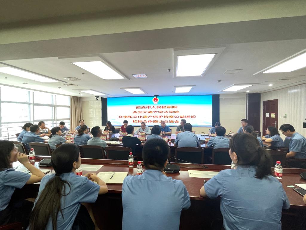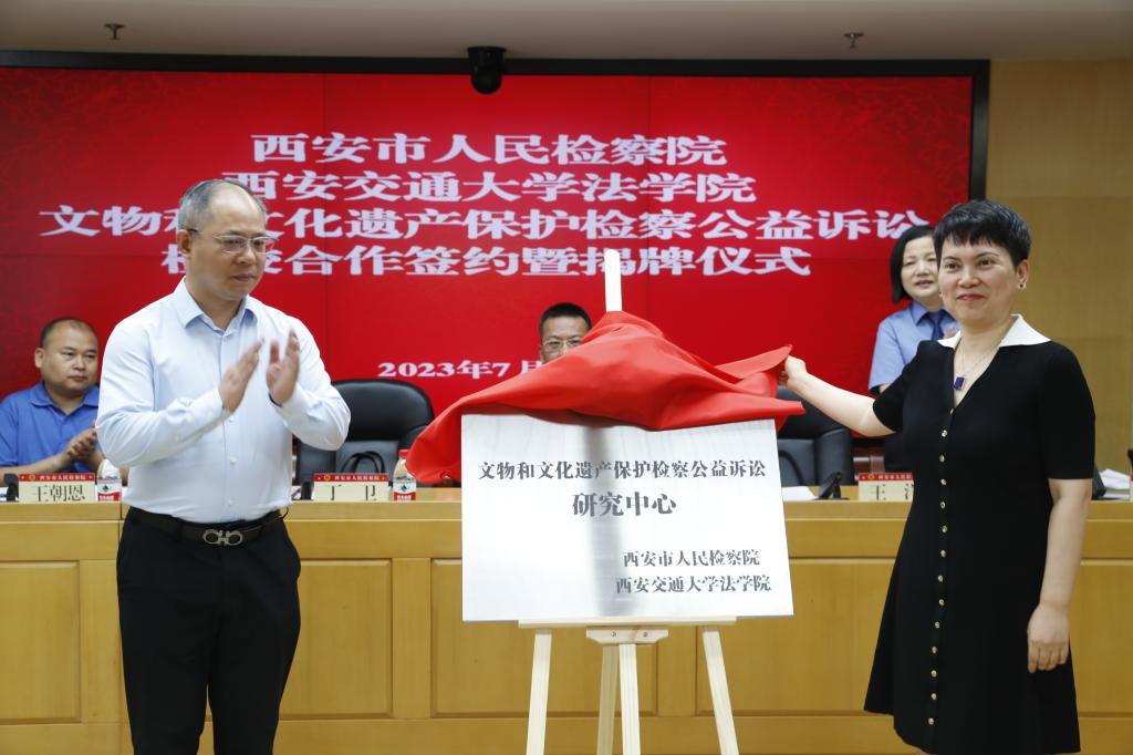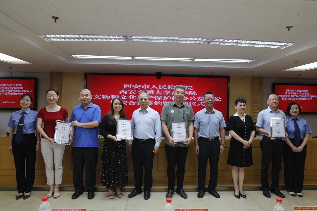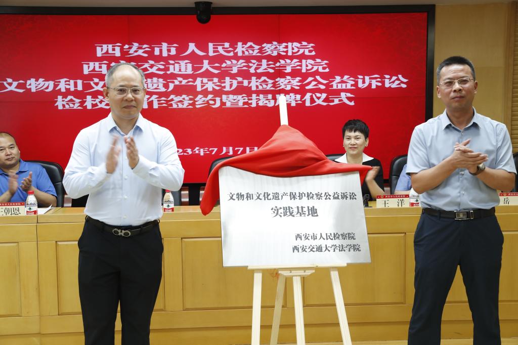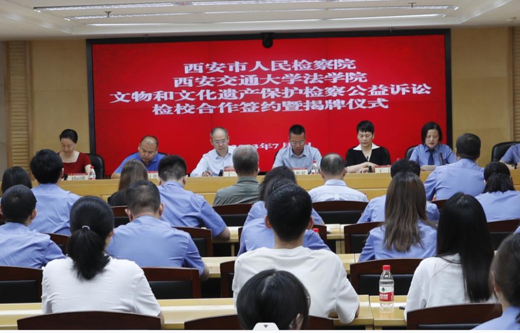 7月7日,西安市人民检察院、完美体育网页版(中国)有限公司法学院共同举办“文物和文化遗产保护检察公益诉讼”检校合作签约暨揭牌仪式。陕西省人民检察院第八检察部主任王洋、西安市人民检察院副检察长韩柏超等领导,西安市人民检察院第八检察部全体干警、各区县院分管副检察长、公益诉讼部门负责人及实务研究员、完美体育网页版(中国)有限公司法学院副院长丁卫、完美体育网页版(中国)有限公司法学院的王朝恩研究员、刘丽娜副教授、特聘专家研究员代表以及西交大法学院首批11名实习生出席仪式。
