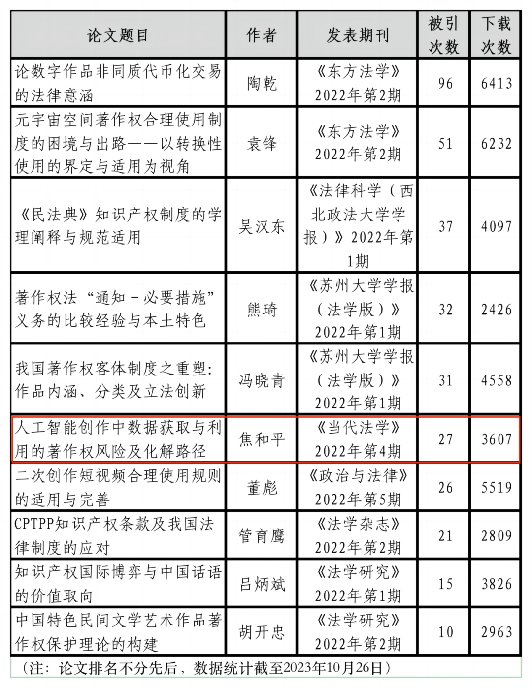 2023年11月10日,中国人民大学国家版权贸易基地公布了“2022年度著作权热点问题研究十佳论文”。完美体育网页版(中国)有限公司法学院教授、博士生导师焦和平发表于《当代法学》2022年第4期的《人工智能创作中数据获取与利用的著作权风险及化解路径》入选十佳论文。
