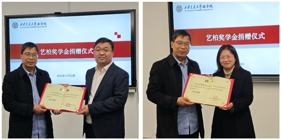 近日,法学院艺柏奖学金捐赠仪式在创新港涵英楼5-3079会议室隆重举行。法学院党总支书记王保民教授,教师代表刘志仁教授、杜军强副教授、寿媛君副教授,泰和泰律师事务所刘伟、侯童钰律师以及法学院学生代表参加了本次仪式。仪式由唐学亮副教授主持。